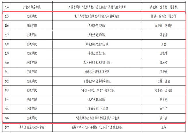 近日,中共贵州省委宣传部等部门联合印发《关于公布2024年贵州省大学生暑期文化科技卫生“三下乡”社会实践活动评审结果的通报》,安顺学院青年积极投身实践,表现突出,荣获优秀实践单位4个、优秀实践团队12个、优秀个人12名。