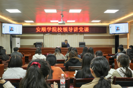 2020年11月16日晚,安顺学院党委副书记陶文彩在特教楼7楼第三会议室为人文学院学生上党课。人文学院党员发展对象、入党积极分子等60余名学生参加党课学习,党课由人文学院党委副书记杨明主持。