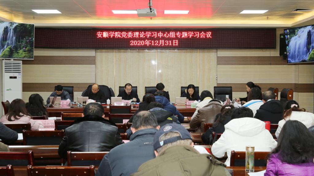 2020年12月31日,安顺学院党委书记罗荣彬主持召开安顺学院党委理论学习中心组专题学习会议,学习《习近平谈治国理政》第三卷有关篇章、《习近平总书记教育重要论述讲义》有关章节,传达学习11月30日、12月11日中共中央政治局会议精神、中央经济工作会议精神、《中华人民共和国宪法》、《中华人民共和国密码法》、《关于转发《中共中央组织部中共教育部党组关于印发普通高等学校院(系)党委会会议和党政联席会议议事规则示范文本的通知》的通知、中共安顺市委宣传部关于转发中共贵州省委宣传部关于转发《中共中央宣传部关于认真组织学习<论党的宣传思想工作>的通知》的通知的通知。