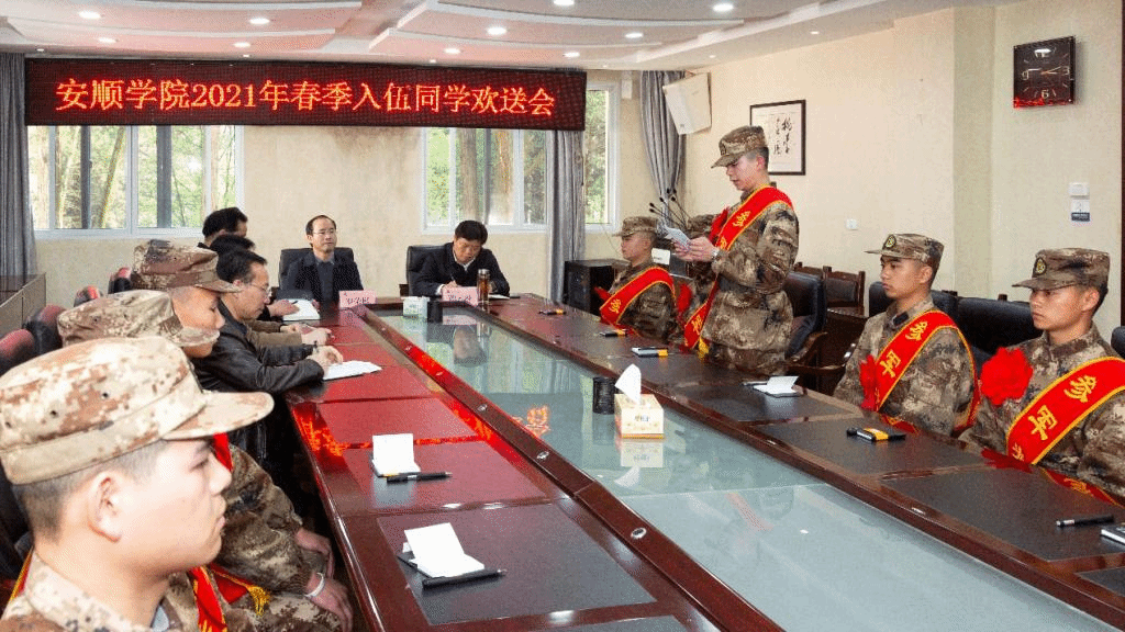 3月15日下午,安顺学院在行政楼二楼会议室召开2021年春季入伍同学欢送会。学校党委书记罗荣彬、校长陈云坤出席会议。学校武装部有关同志和新入伍同学参加会议。