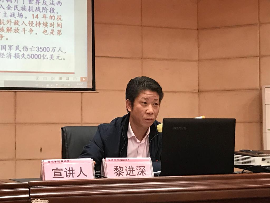 贵州省思想政治理论课教学名师、安顺市党史学习教育市委宣讲团成员、安顺市理论宣讲核心专家、安顺市教育系统百名名师宣讲团成员、安顺学院党史学习教育宣讲团成员、安顺学院马克思主义学院院长黎进深教授以《缅怀辉煌历史,担当时代使命》为题宣讲