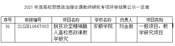 近日,据教育部社科司公布的2021年度全国高校思想政治理论课教师研究专项立项结果,安顺学院马克思主义学院刘金新博士申报的《脱贫攻坚精神融入高校思政课教学研究》课题获批立项,获得资助经费10万元。