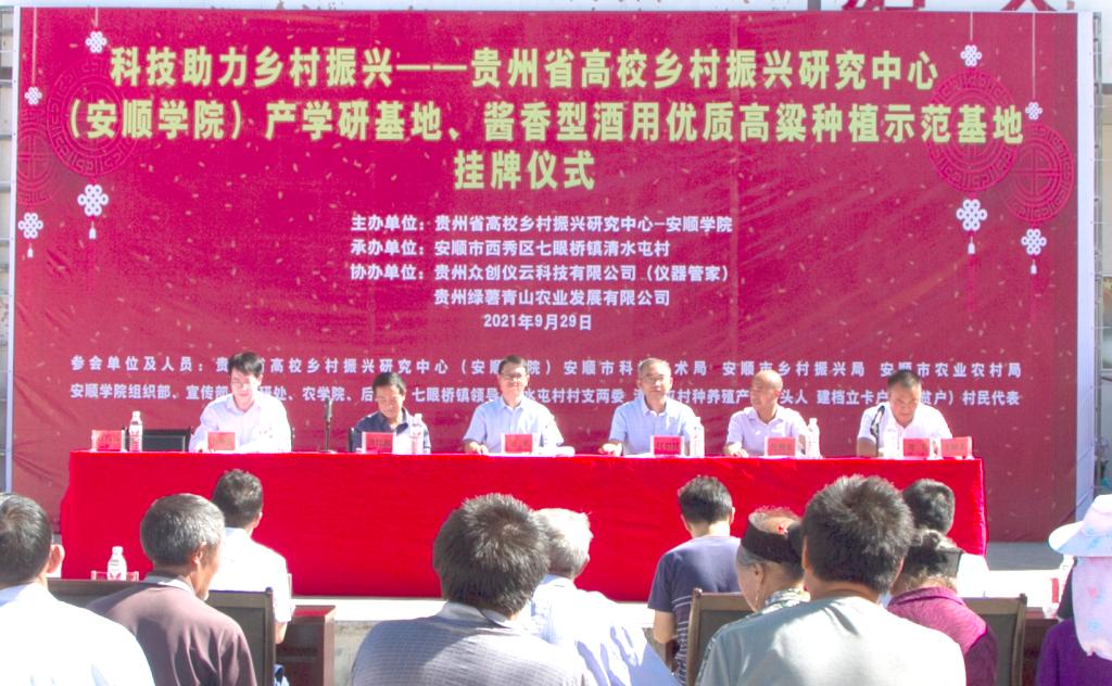 2021年9月29日,由贵州省高校乡村振兴研究中心(安顺学院)主办,安顺市西秀区七眼桥镇清水屯村承办的贵州省高校乡村振兴研究中心产学研基地、酱香酒用优质高粱种植示范基地在清水屯村挂牌。安顺学院副校长张来,国家小麦改良中心贵州分中心主任、贵州省高粱栽培岗位专家、贵州大学农学院教授、博士生导师任明建教授,安顺市科学技术局副局长涂江顺,安顺市乡村振兴局党组成员、副局长王秀勇,安顺市广播电视台、安顺日报社、贵州民族报,贵州众创仪云科技有限公司(仪器管家)、贵州绿薯青山农业发展有限公司、贵州秋萍种植有限公司,安顺学院组织部、宣传部、科研处、农学院、后勤处,七眼桥镇领导、七眼桥镇清水屯村村支两委、安顺学院派驻清水屯村驻村工作队,清水屯村种养殖产业带头人、建档立卡户(脱贫户)村民代表共100余人参加挂牌仪式。