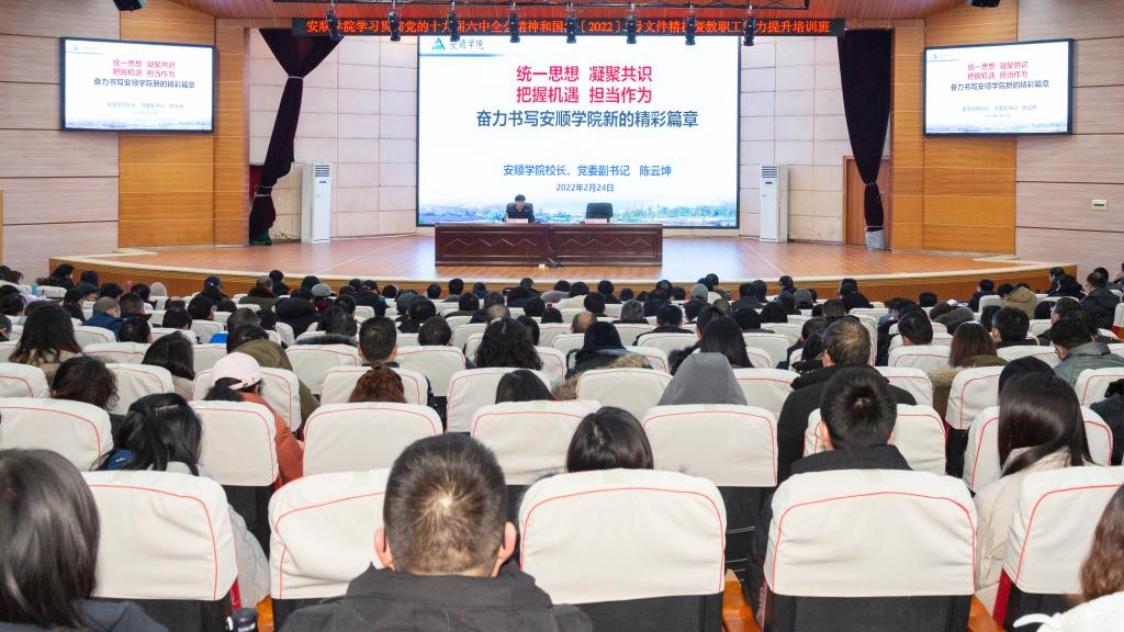 2022年2月24日上午,安顺学院党委副书记、校长陈云坤在学术报告厅以“统一思想 凝聚共识 把握机遇 担当作为 奋力书写安顺学院新的精彩篇章”为题作培训报告,全体教职工聆听学习、认真思考并积极参与研讨。安顺学院党委委员、副校长郭本华主持报告会。