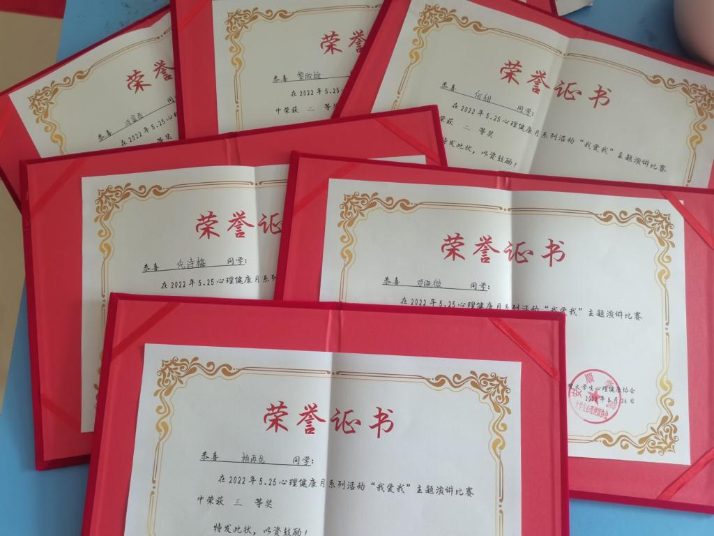 20日至30日,开展了以“我爱我”为主题的心理健康演讲比赛。活动经历了报名、提交演讲稿、对演讲稿进行审核、提交演讲视频、评分、结果公示、奖状颁发等环节。比赛共评出一等奖1名、二等奖2名和三等奖3名。