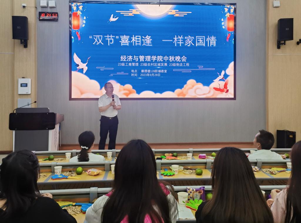 2023年9月28日晚,安顺学院经济与管理学院在顺理楼1-28教室组织召开“双节喜相逢 一样家国情”中秋晚会。安顺学院党委书记罗荣彬与中秋、国庆假期期间留校的2023级新同学欢聚一堂,喜迎中秋,共话团圆。安顺学院经济与管理学院党委书记张红霞、专职副书记周彰波、团总支副书记杨睿、2023级物流工程班班主任邓增强参加。晚会由2023级工商管理班班主任胡晓青主持。