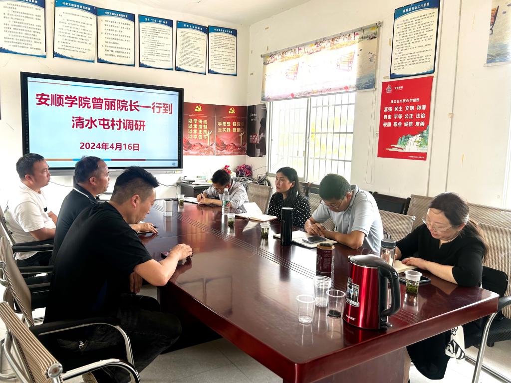 2024年4月16日下午,安顺学院校长曾丽一行到清水屯村看望驻村队员,并与村支两委成员、驻村第一书记和工作队员座谈,围绕产业发展、项目规划、乡村振兴和文化教育工作等方面开展调研。安顺学院党政办公室主任马明、农学院党委书记施渺筱、农学院院长张玉波陪同调研。