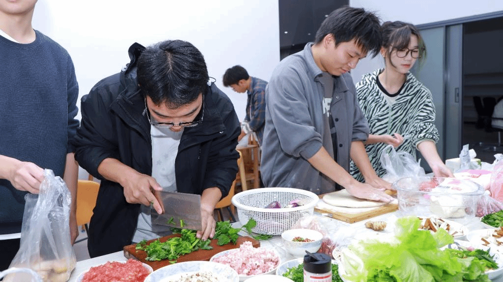 活动现场,热闹非凡。择菜、理菜、洗菜、切菜、配菜、炒菜… ……在锅碗瓢盆的碰撞中,14名同学轮流大展厨艺。煎、炒、蒸、炸、煮,花式手法轮番上阵;贵州菜、广西菜、河南菜………各地佳肴美味汇聚一堂。经过精心烹调,蒜爆虾、白切鸡、芹菜炒牛肉、可乐鸡翅、家常豆腐、河南大饼、凉拌黄瓜、西红柿炒鸡蛋………一道道热气腾腾的菜品陆续出锅摆盘。