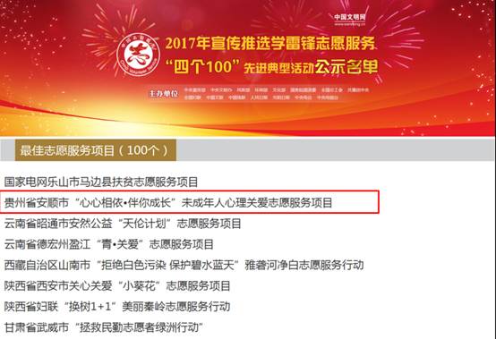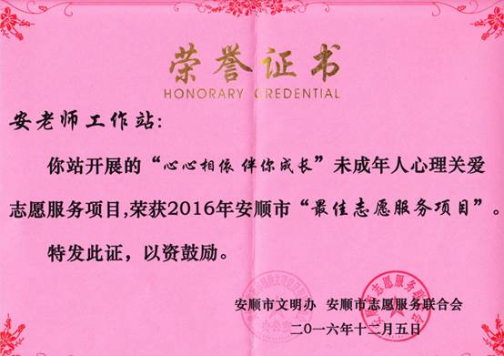 (5)主持开展的“未成年人心理关爱”项目,2015、2016年被评为安顺市最佳志愿服务项目;