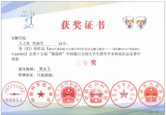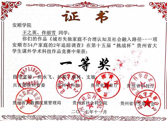 (2)针对城郊农民的城市融入问题报告荣获第“十四届”大学生挑战杯省级三等奖;针对失独家庭的心理干预报告荣获第“十五届”大学生挑战杯国家三等奖、省级一等奖,针对服刑人员的犯罪研究报告第“十六届”大学生挑战杯省级二等奖;