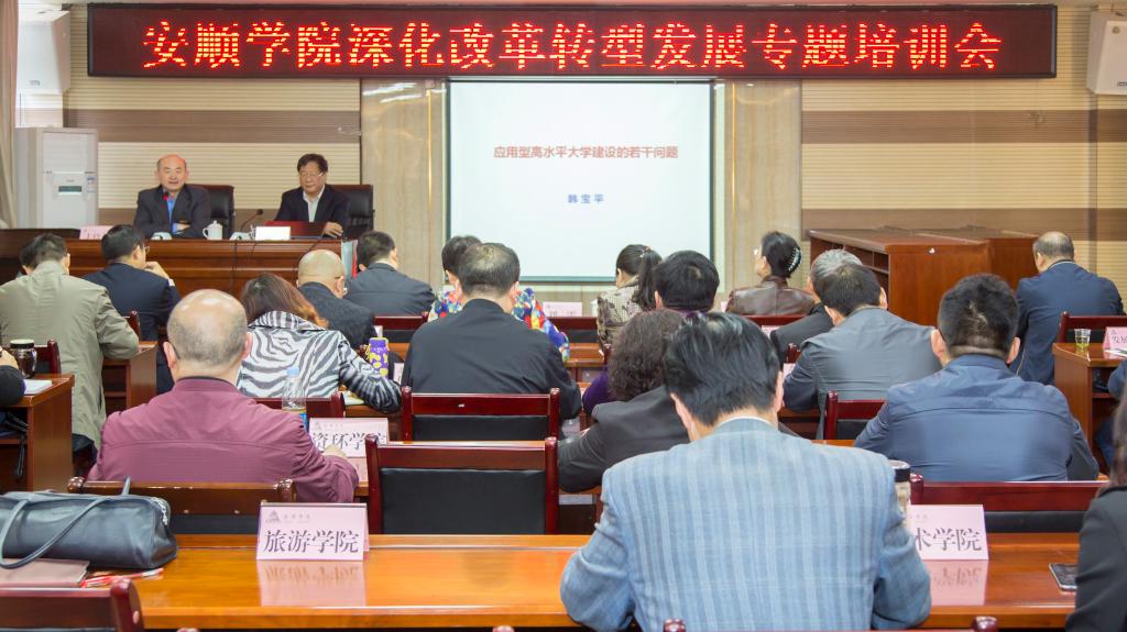 4月25日,全国新建本科高校联盟名誉理事长、徐州工程学院原校长、二级教授韩宝平应邀到我校指导转型发展工作,作题为《应用型高水平大学建设的若干问题》的专题培训。安顺学院校领导,校属各二级学院院长、党总支书记,党政办、组织部、统战部、学生处、人事处、教务处、科研处、实验管理中心、发展规划处、教师工作处、对外交流与合作处、招生与就业指导处、计财处、国资处、审计处、计算机与网络管理中心、图书馆等部门负责人参加培训会。培训会由安顺学院院长刘雷主持。