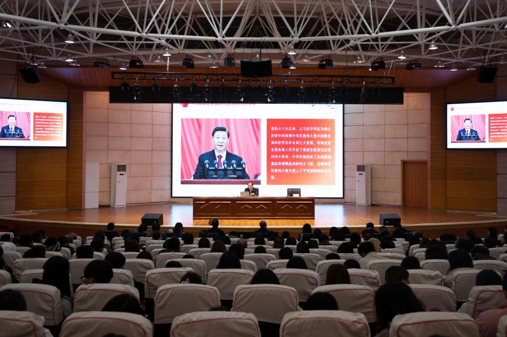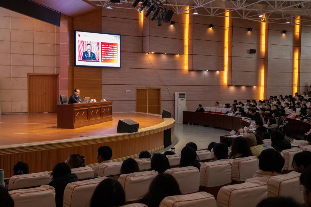 安顺学院校长曾丽,党委委员、纪委书记、监察专员蔡红英,党委委员、副校长韦英,党委委员、副校长殷红敏,以及各职能部门负责人、师生代表共800余人聆听学习。(文/图:学生记者 吴梓均/吴梓均、王镱霖)