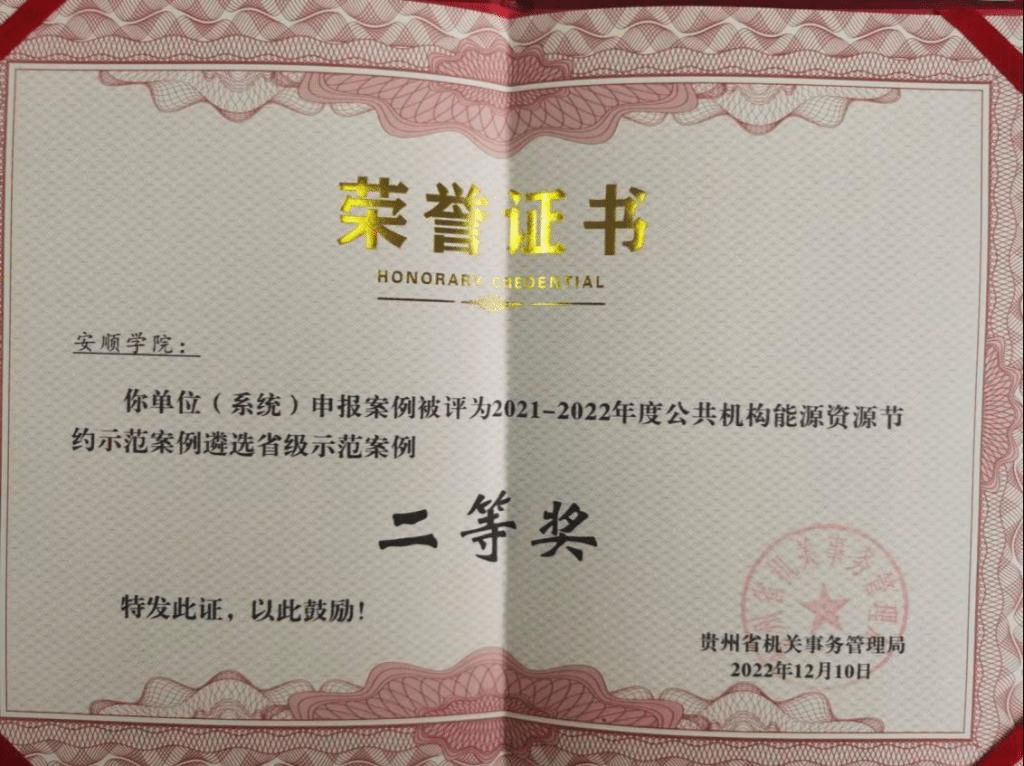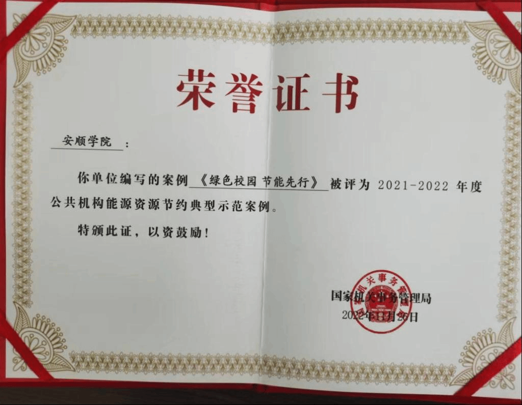按照《公共机构能源资源节约示范案例编制推广实施细则》的要求,国家机关事务管理局和贵州省机关事务管理局组织开展了2021-2022年度公共机构能源资源节约示范案例遴选工作。经多轮专业评审、公示,安顺学院编写的《绿色校园 节能先行》案例被评为2021-2022年度公共机构能源资源节约典型示范案例,并荣获省级示范案例二等奖,国家同省级机关事务管理局分别为我校颁发荣誉证书。