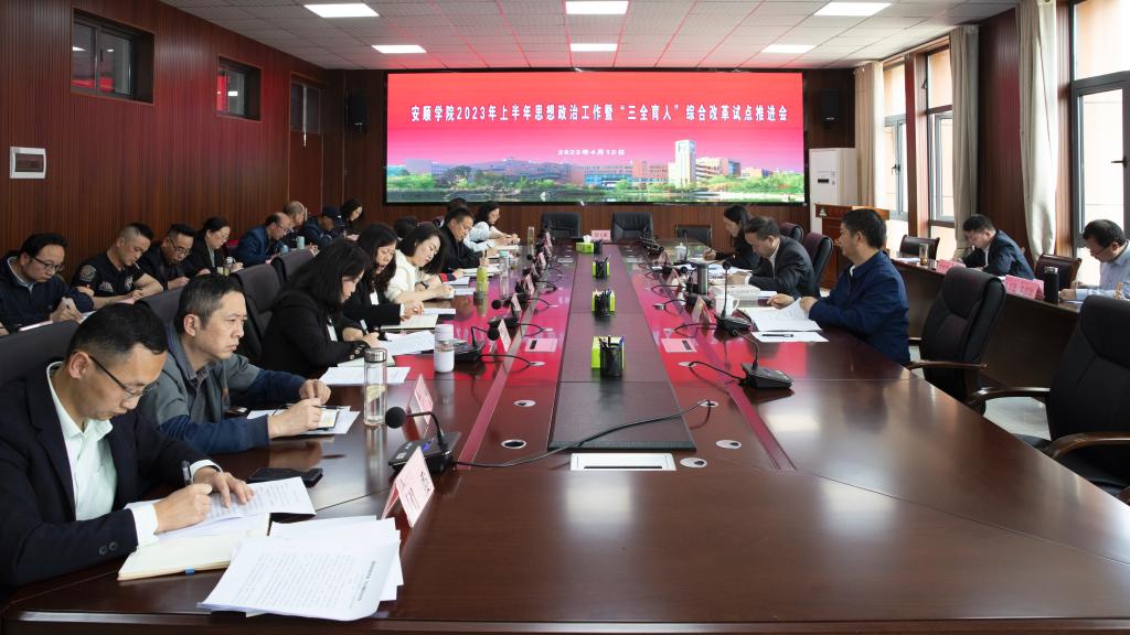 4月12日下午,安顺学院在安道楼五楼第一会议室召开2023年上半年思想政治工作暨“三全育人”工作推进会,坚持为党育人、为国育才的初心使命,落实立德树人的根本任务。有关校领导,各基层党委书记,各职能部门负责人参加会议。会议由安顺学院党委副书记陶文彩主持,党委书记罗荣彬作讲话。