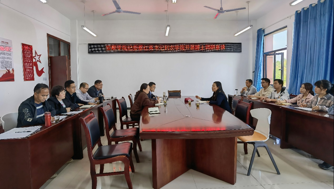 2022年4月11日下午,安顺学院纪委书记、监察专员蔡红英到农学院调研指导并座谈。农学院党委书记施渺筱、院长张玉波、在校博士教师参加座谈会。