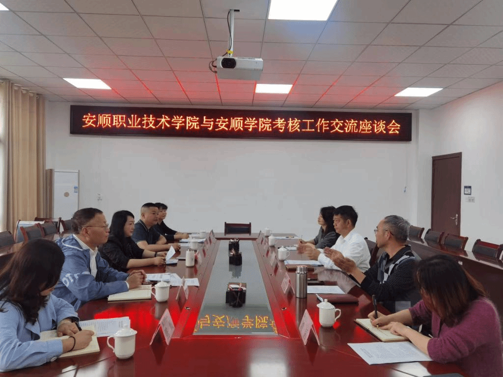 2022年6月2日上午9点,安顺职业技术学院与安顺学院考核工作交流会在安道楼513会议室召开。安顺职业技术学院党委副书记胡祯英,党委委员、组织部部长方小勇,教学质量评价中心主任赵宇光一行,就党委抓党建工作成效考核及促进高质量发展绩效考核等问题与我校进行了深入交流。会议由党委委员、组织部部长何朝越主持,党委副书记陶文彩出席会议并向来宾致辞。