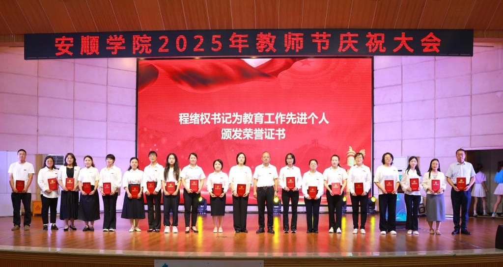 安顺学院党委书记程绪权为教育工作先进个人代表颁发荣誉证书、为2024年9月至今退休教师代表颁发荣休证书,校长曾丽为师德标兵、优秀教师代表颁发荣誉证书,党委委员、副校长杜志明向2025年教龄满三十年教师颁发荣誉证书。
