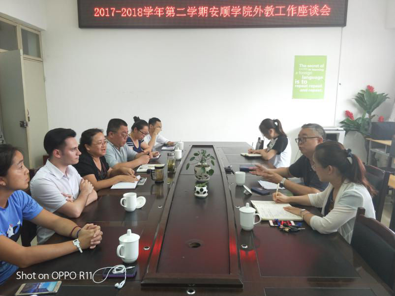 2018年7月12日下午,安顺学院外教座谈会在外国语学院会议室召开。安顺学院副院长令狐荣涛、外国语学院负责人、两名合作教师以及对外交流与合作处全体人员参加了座谈会。