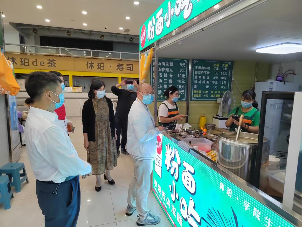 在突击检查过程中,校领导听取了相关部门负责人、第三方服务平台工作人员关于疫情防控措施落实情况的介绍,查看了扫码测温标识、一米线、环境消杀记录、冷链食品管理台账、就餐排队、佩戴口罩、防疫物资储备等情况,及时指出了部分人员口罩佩戴不规范等问题。