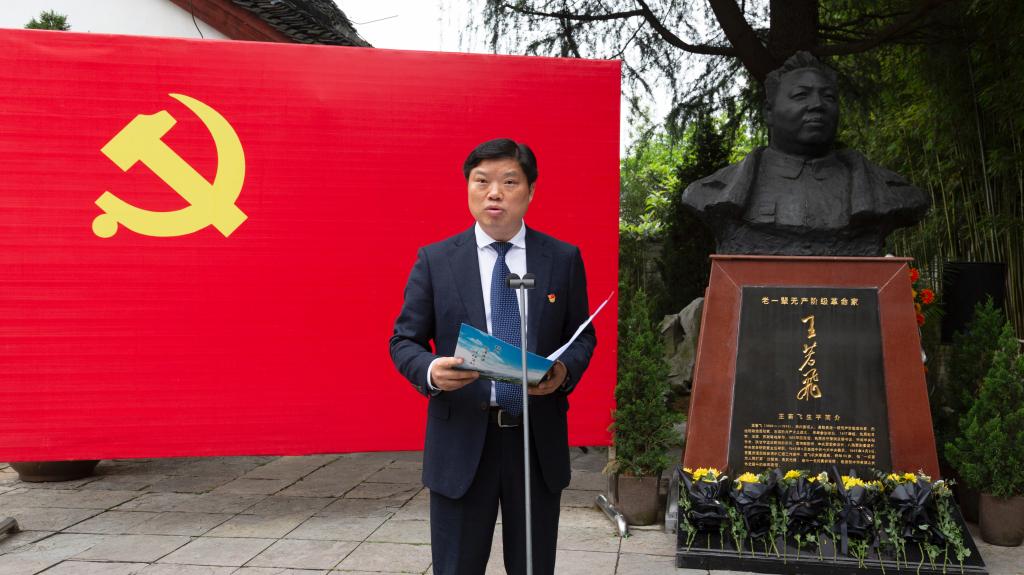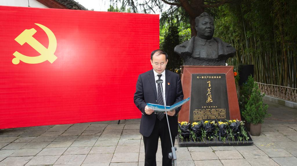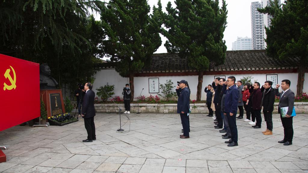 在王若飞故居,罗荣彬一行参观王若飞故居和故居陈列馆,瞻仰王若飞塑像,在王若飞塑像前,校领导向王若飞塑像敬献鲜花,面对鲜艳的中国共产党党旗,罗荣彬带领全体同志举起右拳,重温入党誓词。