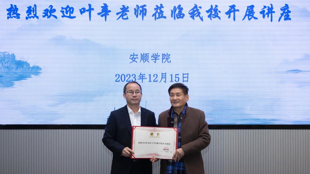 2023年12月15日上午,安顺学院邀请著名作家叶辛到校作“从《巨澜》到贵州巨变-与大学生谈文学创作”专题讲座,并聘任叶辛为终身教授。讲座在我校安道楼1—02阶梯教室举办,由安顺学院党委书记罗荣彬主持。