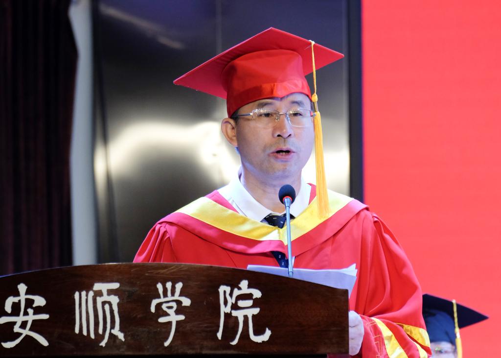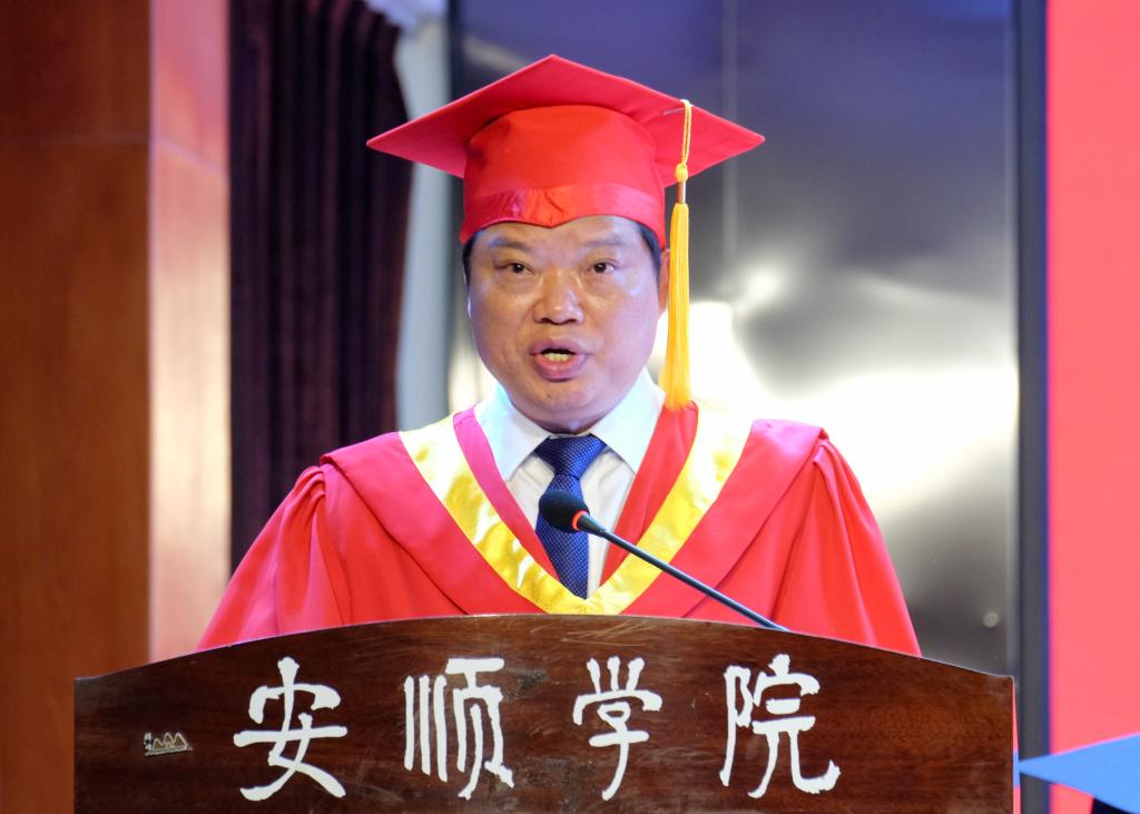 陈云坤校长代表学校向顺利完成学业的2693名毕业生表示衷心的祝贺,并以《默默耕耘静待花开》为题,深情寄语2021届毕业生。他说,今天是同学们大学四年青春和成长的最好见证,同时,四年来,同学们也是安顺学院成长的见证者,见证了学校办学条件得到根本改善、见证了“质量立校”等战略取得丰硕成果。陈云坤校长对2021届毕业生寄语三点希望:希望同学们奋发向上,拒绝“躺平”,要在最美年华里奋发向上,为梦而战,为时代发展贡献自己的应有之力;希望同学们甘于平凡,不甘平庸,要在平凡中承担起实现中华民族伟大复兴“中国梦”的责任与担当;希望同学们向美向善,坚守初心,要始终不忘初心,眼眸有星辰,心中有山海,以梦为马,不负韶华。