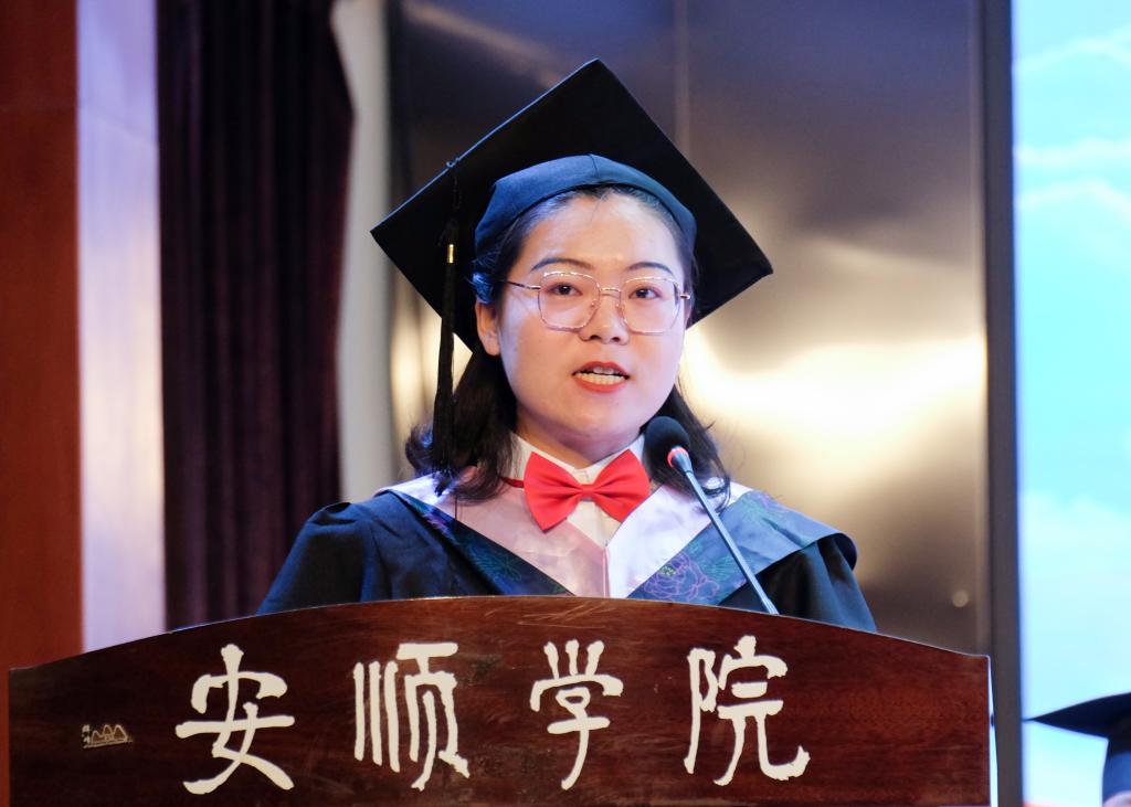 学生代表、人文学院历史学专业侯爱梅表达了对辛勤培育他们的母校的感谢,回忆了在校期间的点滴岁月,也分享了她在安院的奔跑之旅,诠释了对专业的热爱,展现了青春最美的姿态。