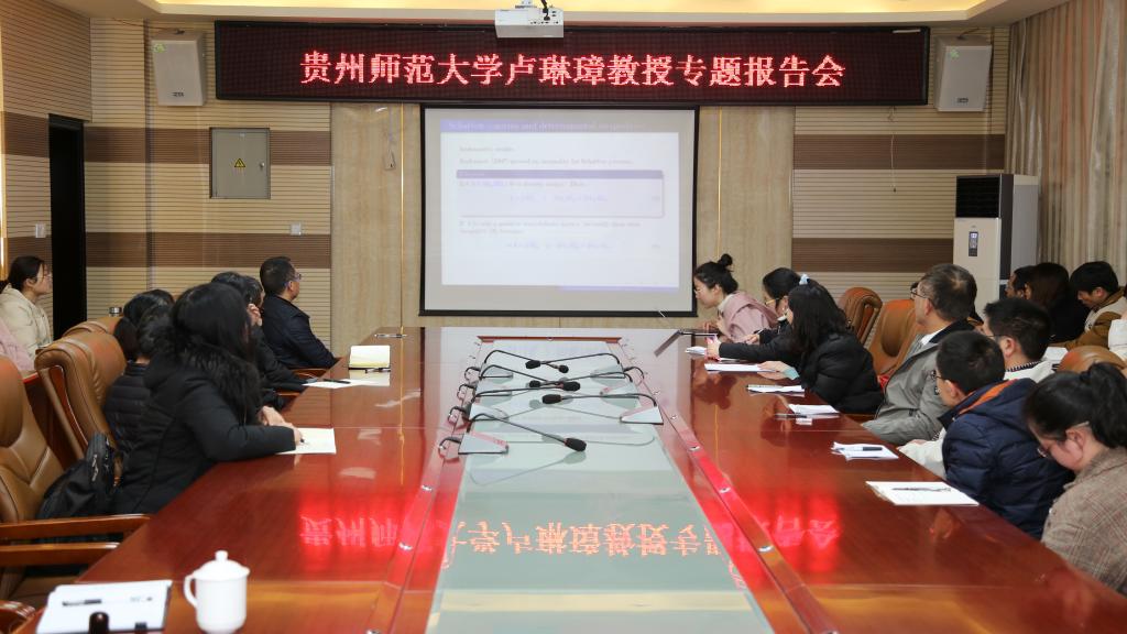 11月26日下午,厦门大学数学科学学院教授、博士生导师,贵州师范大学校长助理卢琳璋应邀在安顺学院特教大楼六楼会议室作题为“扇形矩阵的几个不等式”专题学术报告。安顺学院校长陈云坤主持报告会并致欢迎辞,安顺学院数学与计算机科学学院全体教师及部分学生代表参会。