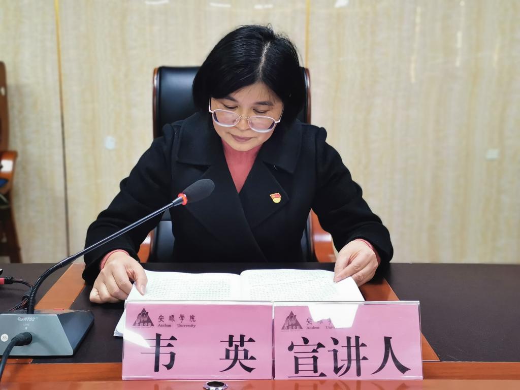12月31日,安顺学院党委委员、副校长韦英为党员干部教师开展了一次详实生动的党的十九届六中全会、省委十二届十次全会和市委四届十二次全会精神专题宣讲。计划财务处党支部全体党员、后勤处、基建处、国有资产管理处、继续教育学院、经济与管理学院、艺术学院全体教职工认真聆听了宣讲。