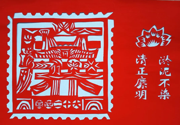 作品简介:作品以“廉”字为核心,旨在突出廉洁文化的核心价值。在“廉”字周围,融入了“清正廉明,淤泥不染”的字样,寓意着在复杂的社会环境中,我们应保持清醒的头脑,坚守清廉的底线。在色彩运用上,采用传统剪纸艺术中常用的红色,红色象征着热情、活力。