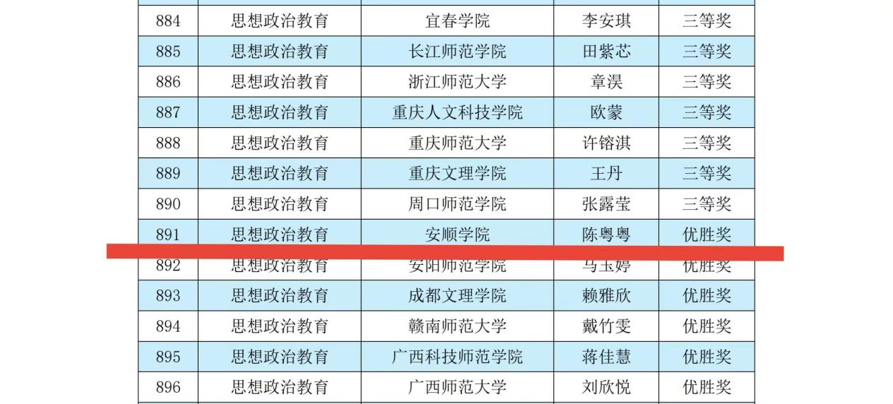 11月21日,第十一届“田家炳杯”全国师范院校师范生教学技能竞赛大赛公布获奖名单,安顺学院马克思主义学院2023级思想政治教育专业陈粤粤同学和黄沙沙同学分别荣获思想政治组和地理科学组优胜奖。此次比赛是我院学生第一次参赛并获奖,体现了我校在人才培养方面课程设置科学、师资指导专业、育人氛围良好,为学生提供了扎实的专业基础和实践机会,也充分展示了我校学生的综合素养和良好的精神风貌!(文/图:教务处 伍柯)