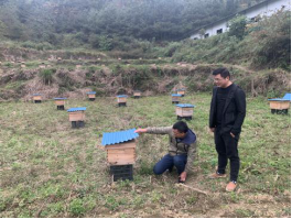 班荣舶(左)现场指导农户掌握蜂蜜养殖管理技术