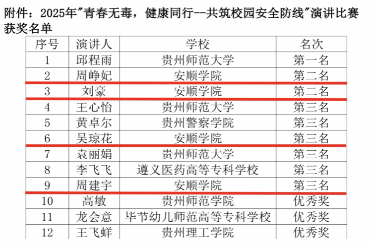 近日,由中共贵阳市委社会工作部等部门联合主办的2025年“青春无毒,健康同行——共筑校园安全防线”演讲比赛在贵州师范大学圆满落幕。安顺学院4名学子凭借出色表现,荣获2个第二名、2个第三名,获奖等次和人数位居全省高校前茅,展现了安顺学院大学生扎实的学识素养与昂扬的青春风貌。