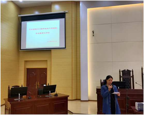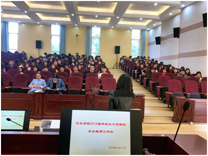 2018年4月17日上午,艺术学院2018届毕业生文明离校工作会在新教学楼A11教室召开。艺术学院党总支书记蒋晓昀、副院长何谦、专职辅导员、2014级毕业班班主任及全体毕业生参加了此次会议,会议由吴曼钰玲老师主持。