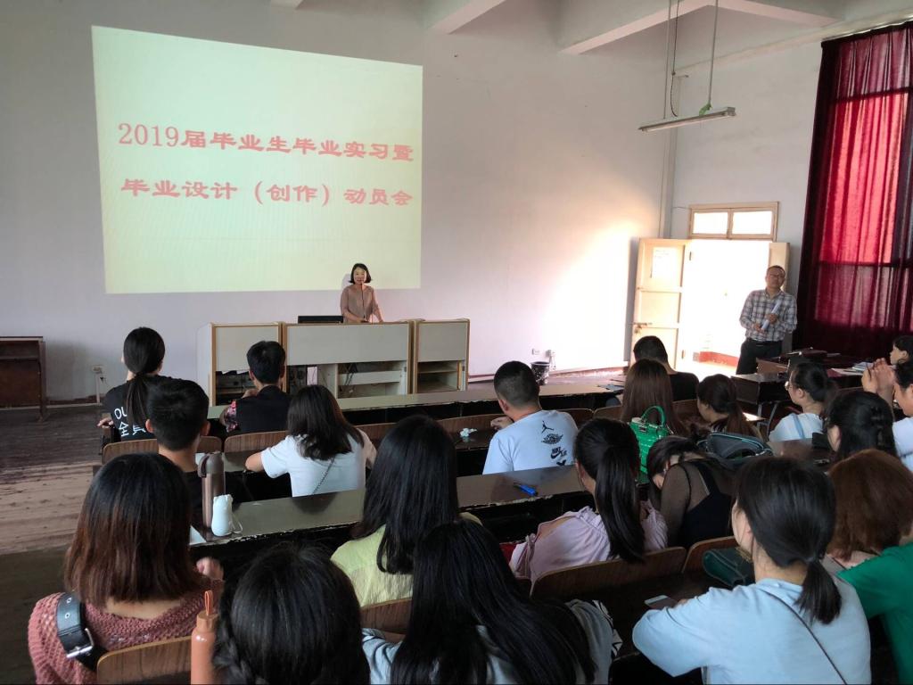 7月4日下午6点,艺术学院2019届毕业生毕业实习动员暨毕业设计(创作)启动大会在电教楼0951教室举行。艺术学院副院长何谦、教学、科研与实践管理科科长付善莉、各毕业班班主任及实习指导教师和2019届毕业生参加了此次大会,大会由教学、科研与实践管理科科长付善莉主持,大会开始,付善莉科长介绍整个会议流程。