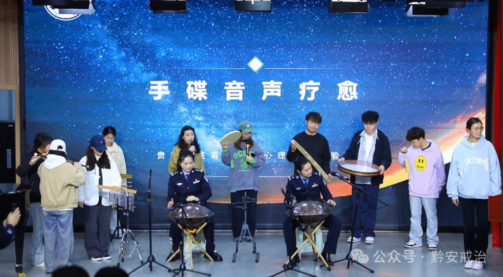 贵州省戒毒管理局心理矫治实验室创新性地将手碟音乐疗愈与各种乐器共同协作,邀请师生们积极参与到其中,借手碟疗愈的独特体验,让大家在舒缓身心的同时,引导大家主动探索内心世界,增强对自我和周围环境的认知,探索如何在喧嚣和充满各种不良诱惑的世界中保持内心平和,形成角色的相互转换,强化了对毒品危害的认识。