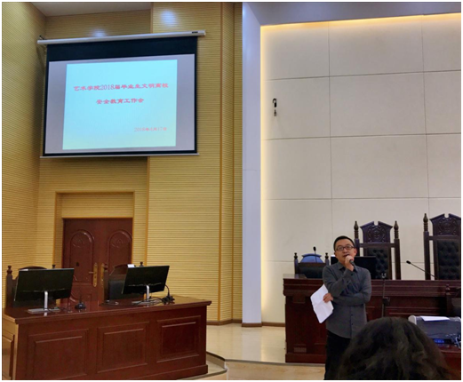 2018年4月17日上午,艺术学院2018届毕业生文明离校工作会在新教学楼A11教室召开。艺术学院党总支书记蒋晓昀、副院长何谦、专职辅导员、2014级毕业班班主任及全体毕业生参加了此次会议,会议由吴曼钰玲老师主持。