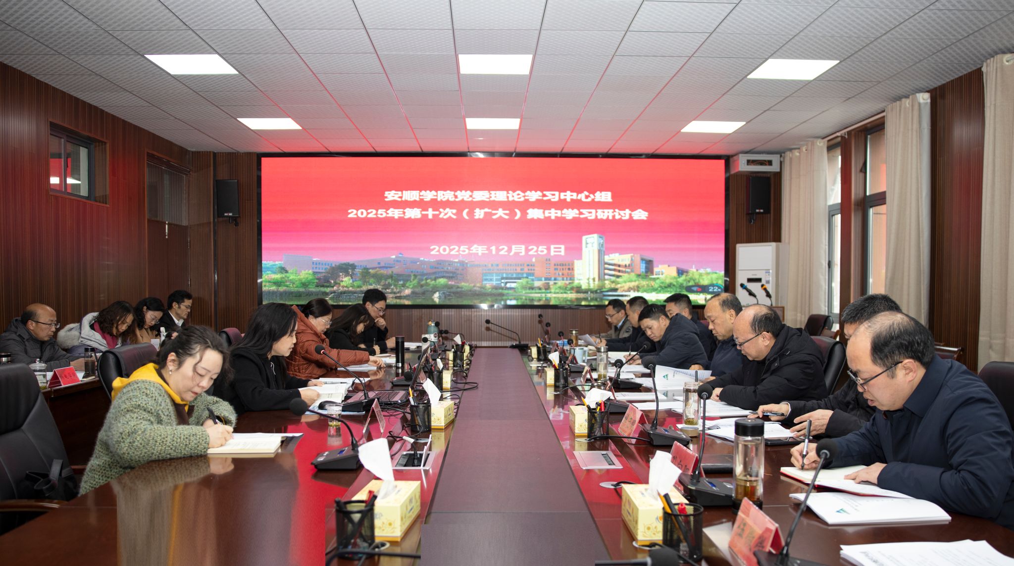 2025年12月25日,安顺学院召开党委理论学习中心组2025年第十次(扩大)集中学习研讨会,以“谋划改革发展,破解关键难题,推动学校高质量发展”为主题,开展调研成果交流。校党委常委结合工作实际在会前开展了调研。安顺学院党委书记程绪权主持会议并提出要求。校党委常委、校领导及各二级党委书记、各部门负责人参加学习。